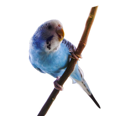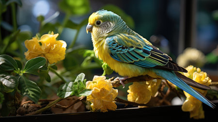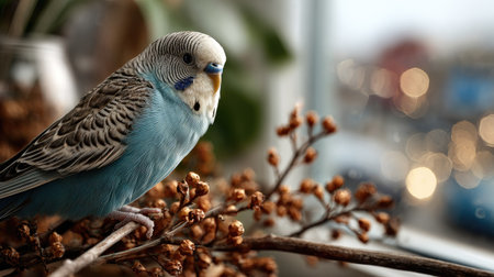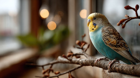 A stunning budgerigar perched on a branch, showcasing its vibrant blue and yellow feathers in a cozy indoor environment with soft, natural light.