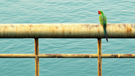 A vibrant green parrot rests on a rusty metal rail, overlooking calm waters. This serene scene showcases animal beauty and the tranquility of nature.