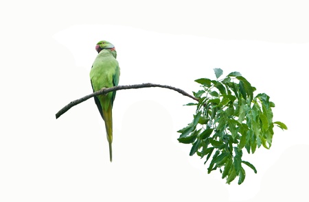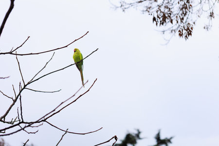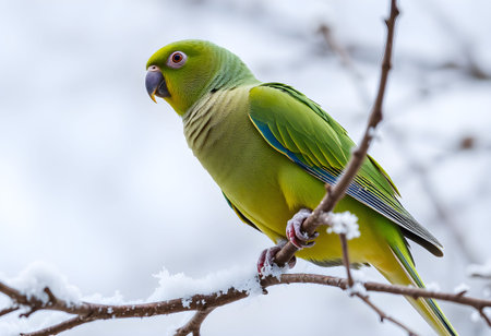 Green Ring Necked Parakeet sitting on a branch covered with snow in winter