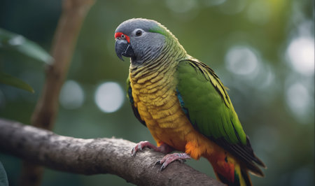 An AI generated illustration of a vibrant colorful parrot perching atop a branch