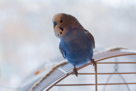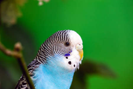 budgerigar, small talking male of blue color, cute playful pet, close-up