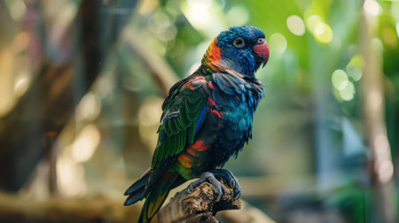 A vibrant parrot with blue, green, red, and yellow feathers perches on a branch. It's positioned in a tropical forest setting with lush greenery and dappled sunlight in the background. The parrot has a red beak and dark eyes, and its feathers have a glossy sheen.