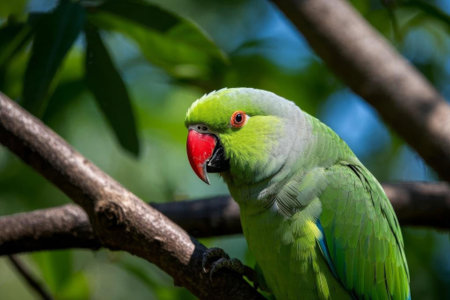 A green parrot is looking at the camera. The bird is perched on a branch. The bird's beak is red