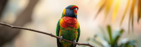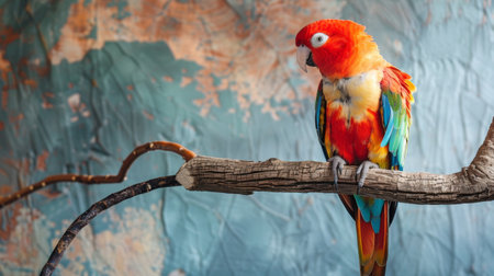 A vibrant and colorful parrot perched on a branch, set against a textured background. Ideal for themes related to wildlife, nature, and exotic animals.