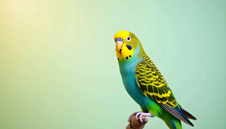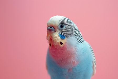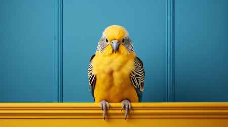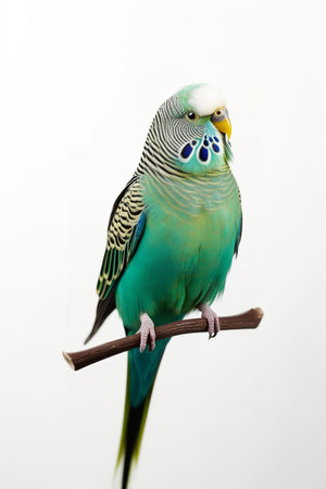 the budgerigar, perched on a stark white background, is captured in an extreme minimalist photography style reminiscent of wes anderson's signature aesthetic, exuding a sense of simplicity and elegance, highlighting the vibrant colors and delicate features of this cute and charming bird. ai generated