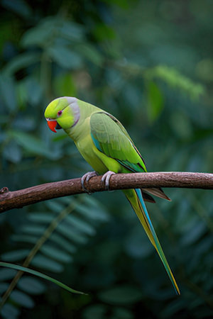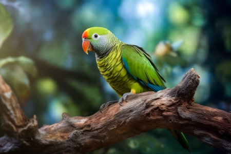 A vibrant green parrot perched on a branch in a lush rainforest.