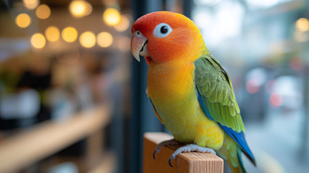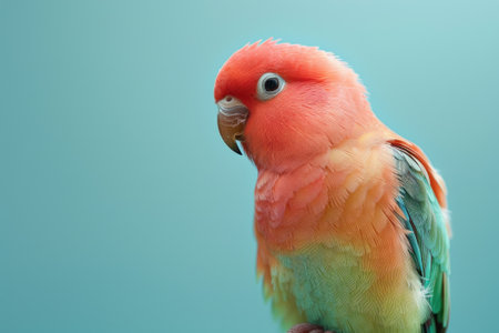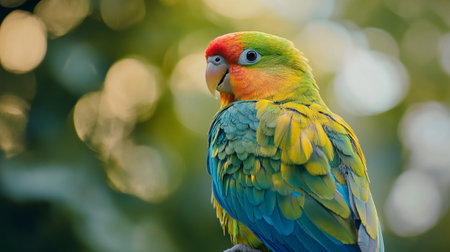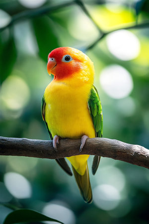 Beautiful Lovebird parrot sitting on branch. This birds lives in the forest and is domesticated to domestic animals