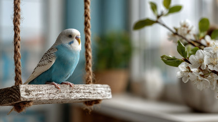 A delightful scene featuring a blue budgerigar resting gracefully on a wooden swing, accompanied by vibrant white blossoms, creating a serene indoor atmosphere.