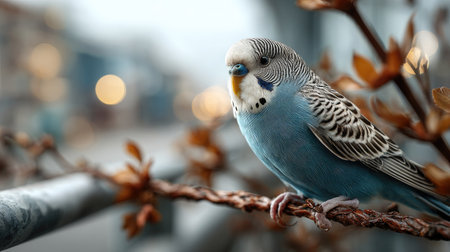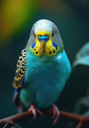 A vibrant budgerigar perched gracefully on a weathered branch, showcasing its colorful plumage against a soft bokeh background, ideal for nature enthusiasts.