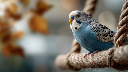 A vibrant budgerigar sits gracefully on a twisted rope swing, showcasing its stunning blue feathers. The soft background creates a serene atmosphere for this charming pet.