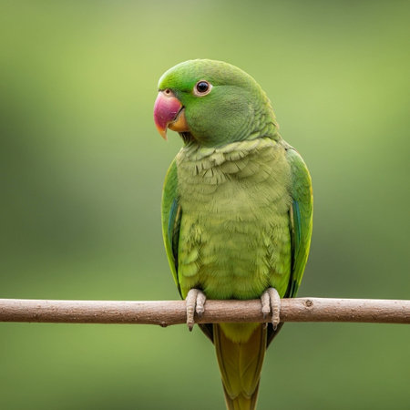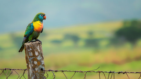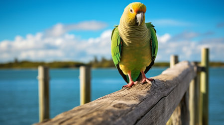 an iridescent green parrot perches on a wooden fence, showcasing its vibrant colors. the photo captures the essence of sky-blue and amber tones, reminiscent of beach portraits. the use of focus stacking and a wide-angle lens enhances the details, while the polished concrete background adds a modern touch. rendered in maya, this image embodies the beauty of nature and petcore aesthetics. ai generated