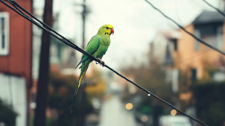 A lively parakeet sits on a power line, its bright green feathers creating a striking contrast against the gray buildings in the urban neighborhood. The setting highlights the bird's beauty.