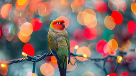 Colorful macaw parrot in festive holiday lights. Concept of vibrant wildlife, tropical birds, Christmas decor. Copy space.