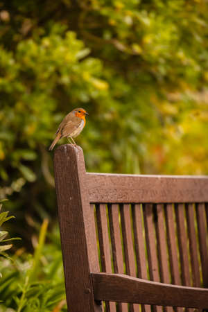 A closeup of a European robin sitting on a wood in a garden with a blurry background