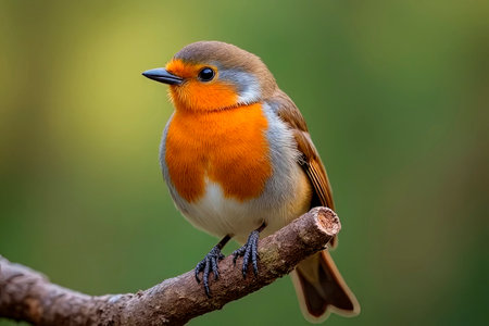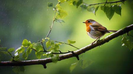 the european robin perches confidently on a weathered wood branch, its brown back and red breast feathers a striking contrast against the lush green foliage of the forest, captured in a stunning photographic style that highlights the beauty of nature and wildlife. ai generated