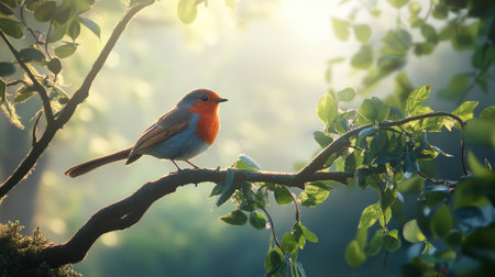 Spring Serenade Robin Singing on Tree Branch in Sunlit Forest