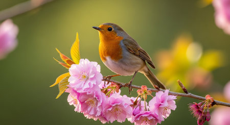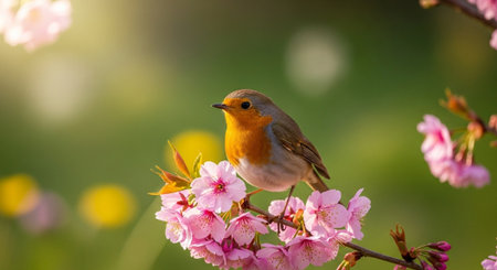 Robin perched on cherry blossom branch enjoying springtime sunlight