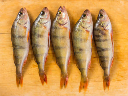 Fresh fish. Fresh river fish perch. On a yellow wooden background. Top view