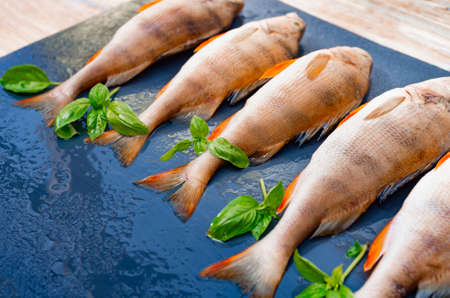 Fresh fish lies on a dark background, sprigs of green basil, top view. River perch for lunch