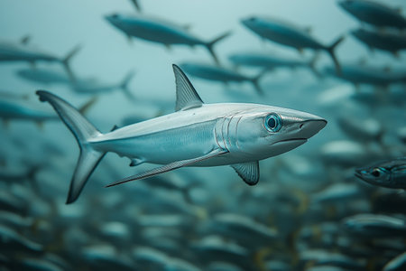 Oceanic shark swims amidst fish school; underwater scene; marine life stock photo
