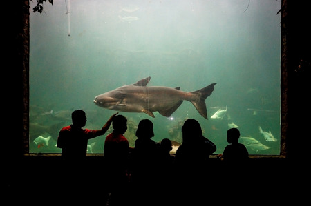 People watching a Mekong giant catfish in aquarium / Pangasianodon gigas