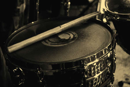 Detail of a drum kit closeup . Drums on stage retro vintage picture.