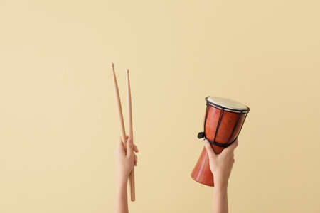 Woman holding djembe and drumsticks on color background