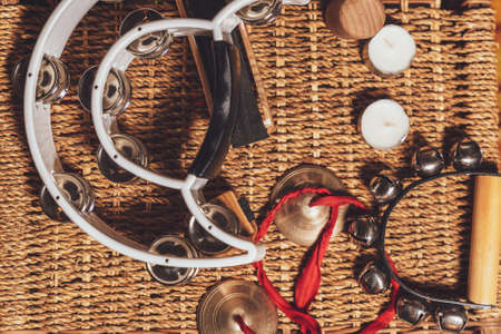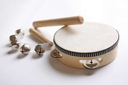 Wooden tambourine, rhythm stick and hand bells on white background. Montessori musical toy