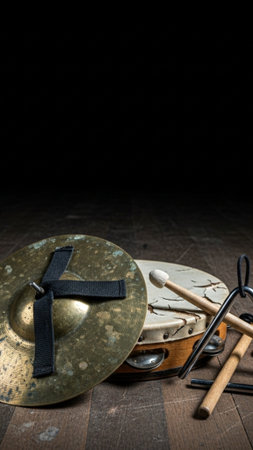 A vertical, tall format photograph (9:16) capturing vintage brass band percussion instruments--cymbal