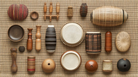 A visually captivating arrangement of assorted musical instruments and handmade crafts, showcasing natural materials and intricate designs on a bamboo background.