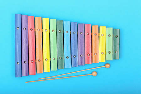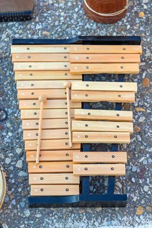Image of tambourine and drumsticks lie on a wooden xylophone