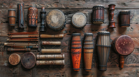 This captivating image features a diverse collection of traditional drums artistically arranged on a richly patterned textile, showcasing cultural heritage.