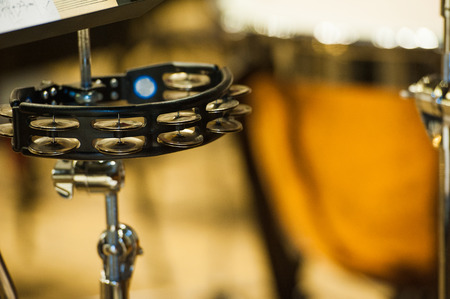 A selective focus and close-up view on professional bar chimes, drums accessories, blurry view of a man playing drums in the background