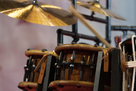 drums for percussion, drums for playing with hands, drums with microphones on a bokeh background