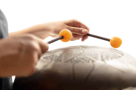 A close up of hands playing the hank drum on white studio background. Concept of hobby, professional occupation, music, traditions, festival. Copyspace for your ad. Ethnic instrument.