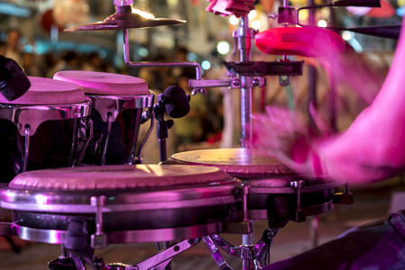 These are the beats of Brazil. Closeup shot of a musical performer playing drums with his band.