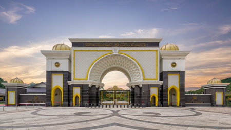 The grand entrance of Istana Negara stands majestically against a colorful sunset. This royal palace in Kuala Lumpur, Malaysia represents Malaysias cultural heritage and architectural elegance