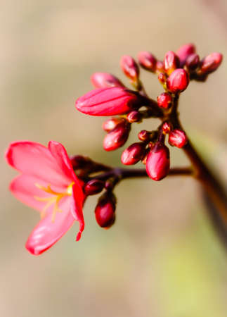 Jatropha flowers and green leaves. Blooming shrub with small red flowers. Background with exotic plant