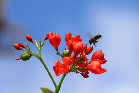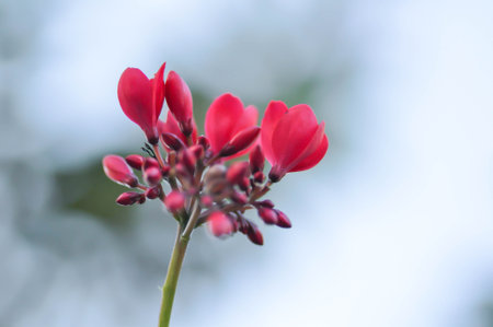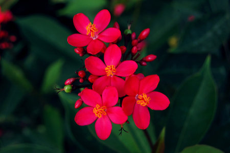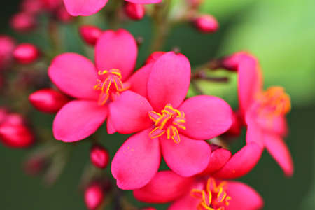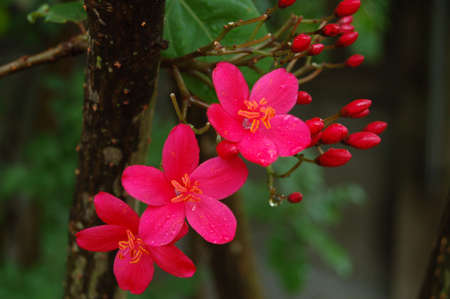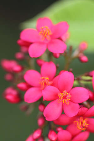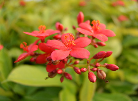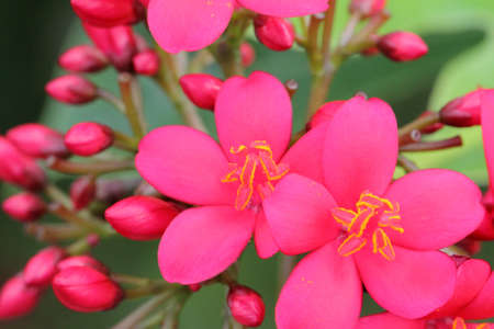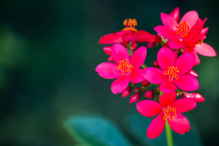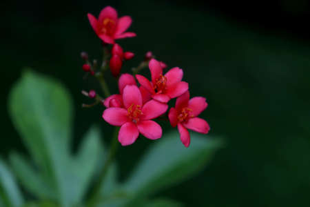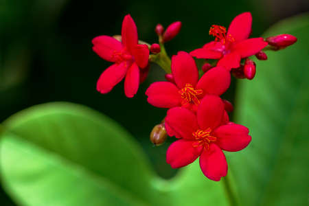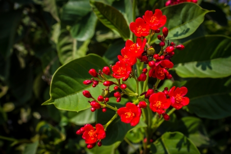 Cotton leaved jatropha, Peregrina, Spicy jatropha red flowers and green leaves background in the garden