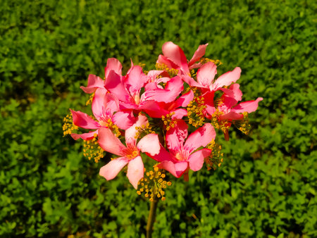 Photo of Peregrina plant (Jatropha integerrima) commonly known as peregrina or jarak pedas, is a shrub. photo of flowers with green leaves background.