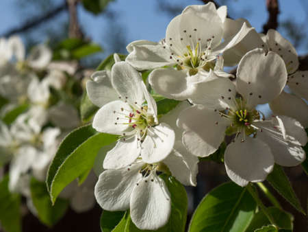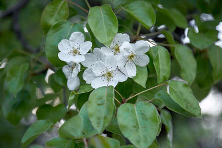 Flowers of Pear Tree, Pyrus communis, with leaves, close-up on bokeh background, selective focus, shallow DOF.