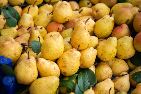 Organic market fresh Pears on an agricultural market. Image of fruit product pears
