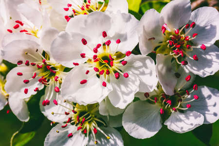 macro photo of blooming pear blossoms on a nice sunny day