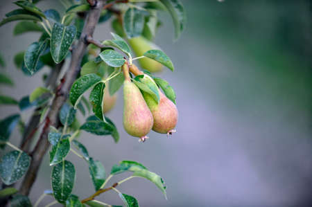Pears on a branch with water drops, copy space, close up