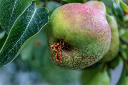 Rotten Pear on the fruit tree, Monilia laxa (Monilinia laxa) infestation, plant disease. The lost harvest of pears on the tree. Fruit plant disease. Farming