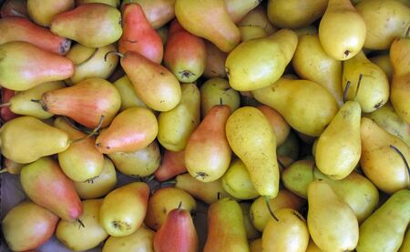 Farm fresh organic pears as background, top view. Pears are rich in essential antioxidants and dietary fibers. They also reduce risk of cancer, diabetes and heart disease.