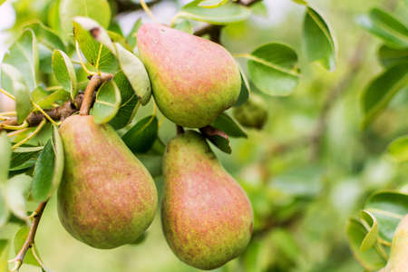 Lovely cluster of conference pears (Conference - Pyrus communis) ripening in pear tree (fruit tree). Sunny summer day Space to insert your text.