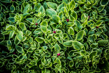 Green leaf background. Processing under the film in cold colors. Helichrysum petiolare, silver-bush everlastingflower. Asteraceae family