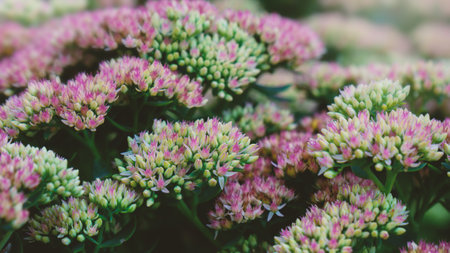 Nature texture background with bunch of little pink flowers of plant autumn joy