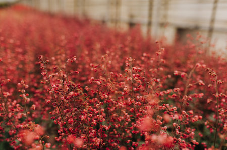 Beautiful fairy dreamy magic red and yellow flowers with dark green leaves, retro vintage style, shabby chic effect, soft selective focus, blurry background, copyspace for text